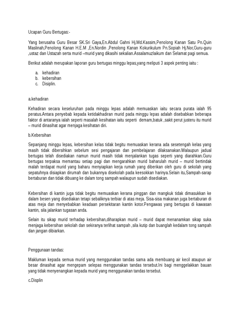 UCAPAN GURU BERTUGAS PADA WAKTU REHAT. Contoh teks ucapan perhimpunan sekolah. 26022015 teks ucapan guru bertugas semasa perhimpunan mingguan sekolah to address concerns about learning environment assalamualaikum warahmatullahi wabarakatuh salam sejahtera dan selamat pagi terima kasih saudara pengacara majlis yang berusah.